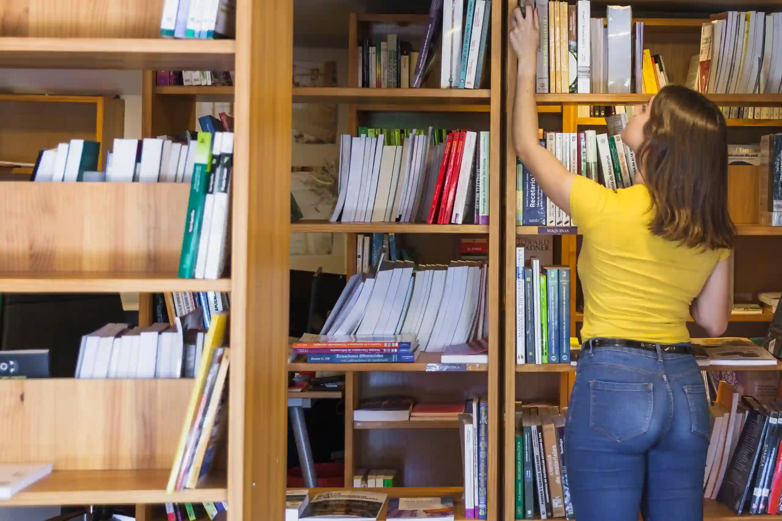 Library cleaning services dusting bookshelves and organizing reading areas.