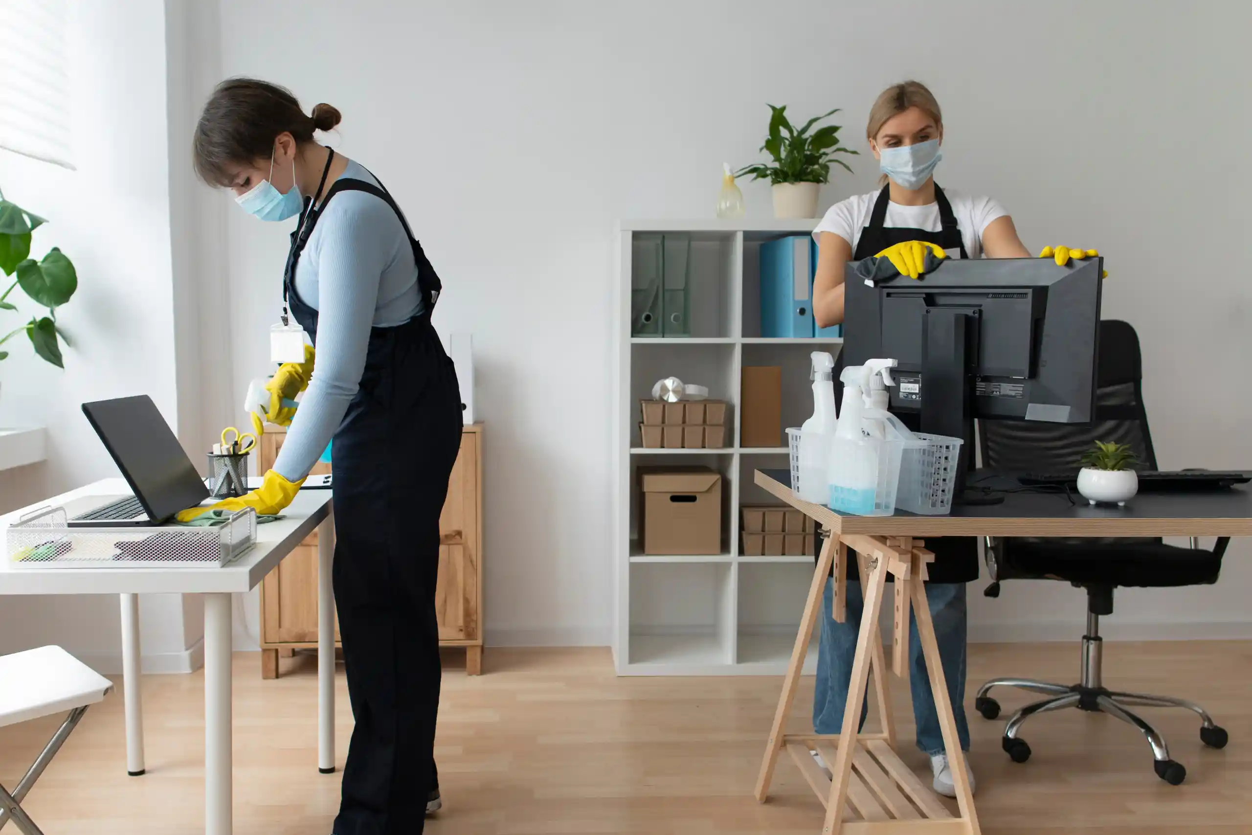 Professional cleaner wiping surfaces in a bright, modern office environment.